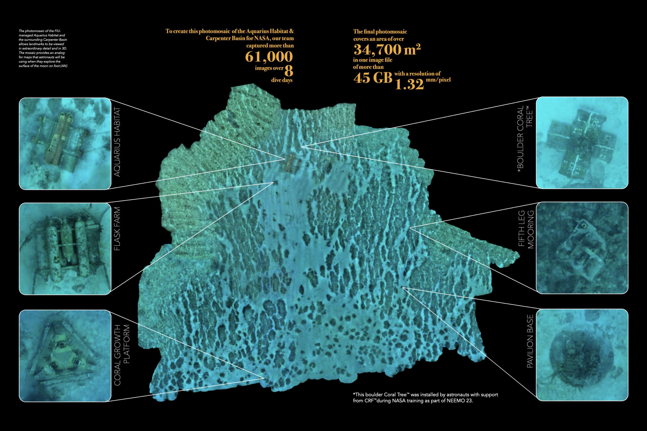 Over the years, CRF has contributed to this work through both technical innovation and hands-on training. In 2021, as NASA prepared for its next phase of human lunar exploration, the agency commissioned CRF to produce a high-resolution, three-dimensional photomosaic of the Aquarius habitat and surrounding seafloor. Built from more than 60,000 images captured over eight days of diving, the map spans nearly 35,000 square meters (roughly the size of five football fields) at millimeter-scale resolution. At that level of detail, even the smallest features of the habitat structure, down to the bolts that hold it together, can be clearly visualized in 3D. This extraordinary map created a precise environmental analog for how humans may navigate unfamiliar terrain beyond Earth.