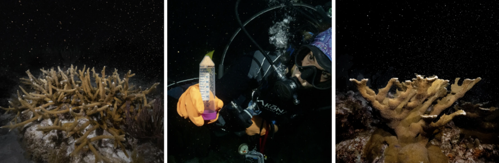 Our mission at North Dry Rocks was to document the timing of the coral spawn to inform future predictions. We were sharing the area with researchers from NOAA whom we had been in communication with to ensure a smooth and cooperative night on the reef. NOAA placed gamete collection tents over our outplanted colonies. When the big moment finally occurred around 10:15pm the entire water column came to life! Millions of tiny floating gamete bundles filled the sea, and the NOAA spawning nets, and collection tubes filled to the brim. Our team frantically recorded colony genotypes, the start time of spawning and the duration, all while fighting the urge to dance with excitement underwater.
