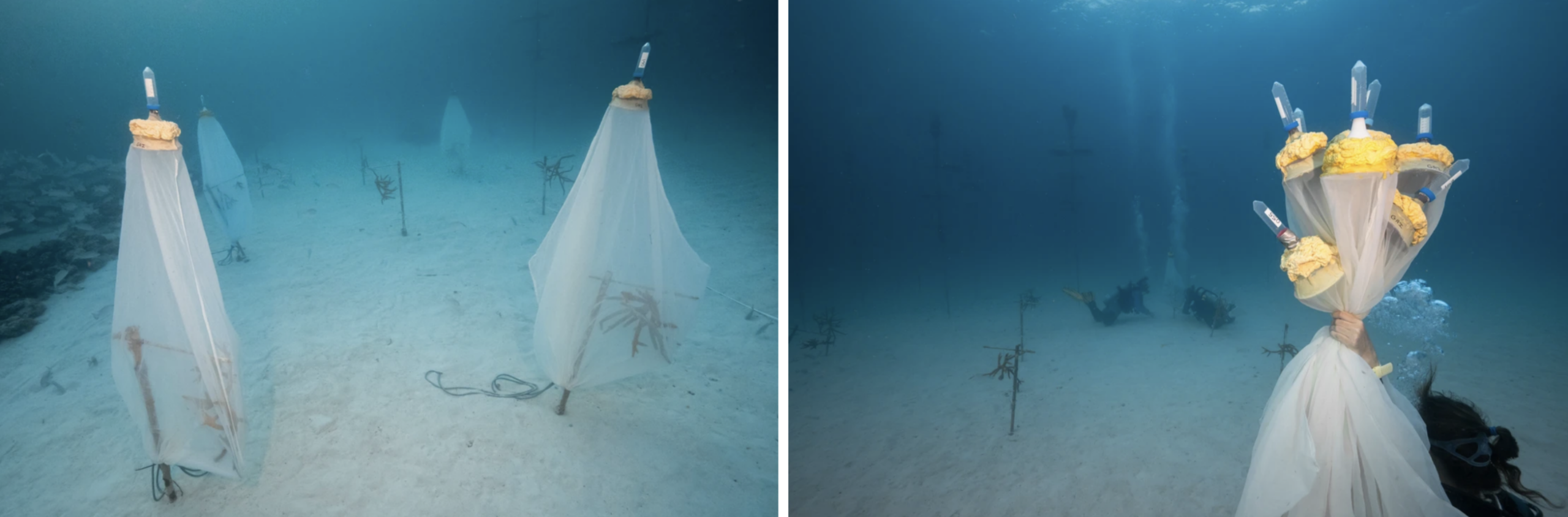 Meanwhile over in one of our Coral Tree™ Nurseries another group of divers led by our Science Program Manager Amelia Moura was watching the carefully selected corals in our spawning alley. Prior to this predicted spawning week Amelia and some of our staff selected a variety of staghorn genotypes from our gene bank to be placed in a specific area of our open-ocean nursery we call “spawning alley”. This selection ensures we are gathering gametes from a variety of genotypes and accurately monitoring the spawning of each without having to swim through 500 Coral Trees™. The spawning in our nursery was slightly less intense on Saturday but our collaborators at SEZARC still managed to cryopreserve multiple genotypes of coral gametes from our colonies which they will use in future genetic research.